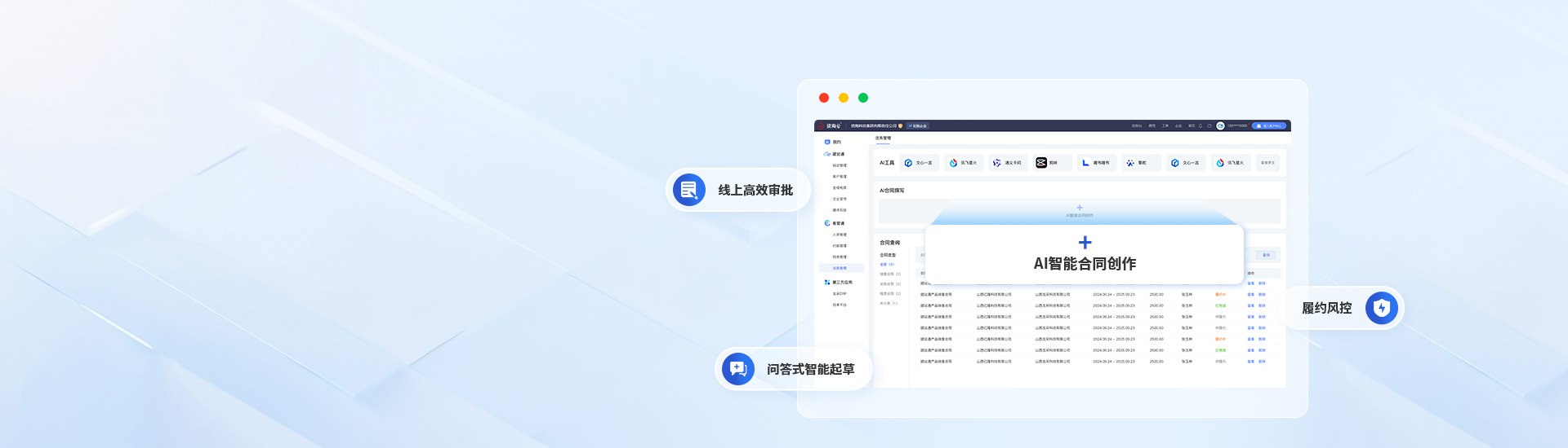 法務管理系統(tǒng)深度融合AI技術,覆蓋從智能撰寫、在線審批、審查校對、風險預警至歸檔管理的合同全階段管理,確保流程標準化與數(shù)據(jù)流通無阻。AI問答智能合同生成,極大優(yōu)化了合同起草流程,有效提升工作效率、規(guī)避合同法律風險。以企業(yè)需求為核心,為企業(yè)法務管理帶來高效、便捷與安全的全新體驗。